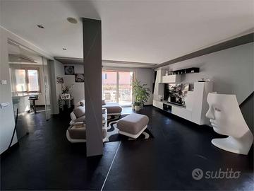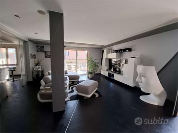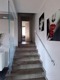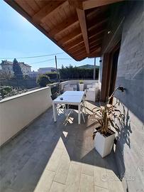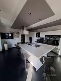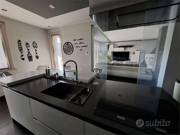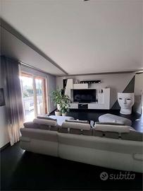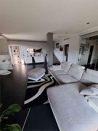 Il piano abitativo principale è il piano rialzato, dove troviamo il soggiorno molto grande, con vetrate sull' ampio terrazzo, cucina abitabile con bellissima penisola, dal soggiorno si accede al bagno di servizio, con ampia vasca doccia, tramite pochi gradini si accede alla zona notte, dove troviamo una camera matrimoniale con angolo palestra, il bagno, doppia cabina armadio, e una doccia/sauna tutta in mosaico, oltre ad una ulteriore camera, ideale anche come studio.