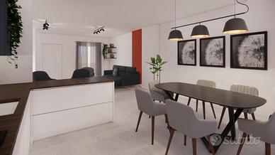 ampio openspace con zona living con grandi finestre che si affacciano sul giardino privato perfetto per momenti di relax o per intrattenere gli ospiti, zona pranzo e cucina a vista. Proseguendo il disimpegno, conduce al bagno di servizio e alla scala interna che porta al primo piano.