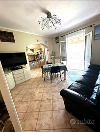 Poveromo. A circa 800 metri dal mare si vende porzione di villetta bifamiliare sviluppata su unico piano terra con bel giardino privato su tre lati. Ristrutturata recentemente si compone di ampio soggiorno con cucina a vista, disimpegno notte, una camera matrimoniale, una camera doppia ed ampio bagno. Portico per pranzare all'aperto, casetta in legno ad uso deposito, zona lavanderia sul retro dell'immobile e zona parcheggio per tre auto. Impianto di climatizzazione.e allarme