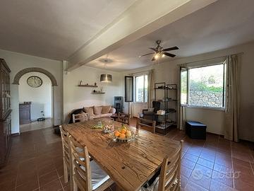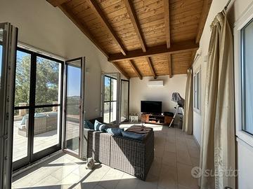 (Riferimento: 13) Villa San Pietro Inserita in un contesto di assoluta tranquillità e privacy, a pochissima distanza dalla bellissima spiaggia di Nora, da Pula e appena a 30min da Cagliari, disponiamo di un ampia e rifinita villa indipendente. La proprietà, interamente ristrutturata, è composta da un ampio e ombreggiato loggiato che conduce a un ingresso soggiorno, cucina abitabile, disimpegno, tre camere da letto e bagno. Al piano superiore un ampio locale open space con uscita sulla terrazza panoramica completa questa bellissima villa. Un ampio giardino di circa 4000mq e un locale esterno pluriuso con servizio completa questa interessante e rara soluzione.