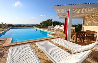 Di dimensioni più generose e concepita con un gusto lussuoso, Villa Ganzeria domina la campagna circostante offrendo una splendida vista panoramica sulla costa. La superficie totale è di circa 450 mq, suddivisi tra i 350 mq del piano terra e i 100 mq del primo piano.