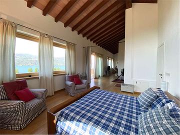 A Ranco, inserita in un'oasi di pace, proponiamo in vendita splendida villa indipendente immersa nel verde. La proprietà è stata edificata su un fondo agricolo ed è caratterizzata da ampie metrature e vetrate, gode di ottima esposizione solare e vista lago ed è circondata da splendida vigna e ampio giardino, entrambi di pertinenza esclusiva. L'abitazione si sviluppa su tre livelli: al piano terra si trova ingresso su luminoso soggiorno, ampia cucina con vista giardino e lago, due locali servizi e due camere di cui una con affaccio esterno diretto. Il piano superiore è composto da camera da letto, ampio locale con accesso su balcone vista lago e zona servizi con doccia. La proprietà prevede anche seminterrato con cantina, ideale da destinare a locale hobby, zona lavanderia, locale tecnico, cantina vini e formaggi, box e taverna. Immobile in gestione presso la sede operativa di Sesto Calende, via San Bernardino 29 Tel. Agente di riferimento Matteo Costa RIFERIMENTO: VMC1326 CLASSE ENERGETICA: E 130 kWh/m2 a
