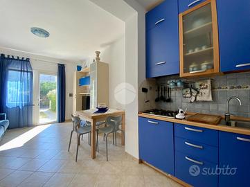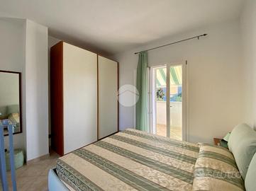 Al piano terra si sviluppa la zona giorno con soggiorno con angolo cottura valorizzati da camino a legna angolare, bagno finestrato con box doccia, cameretta con portafinestra che conduce alla corte retro e due comodi ripostigli nel sottoscala. Una scala interna in granito peperino conduce al primo piano dove si trova la camera matrimoniale con accesso a due balconi, uno frontale e uno posteriore con vista mare.