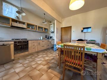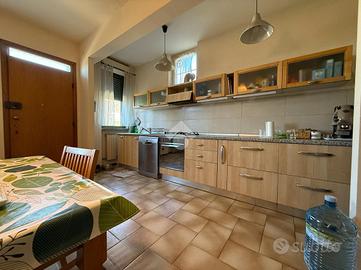 La villetta si sviluppa su tre livelli: al pian terreno si trova la zona giorno in cui si trova un'ampia cucina abitabile, l'ampia e luminosa sala e un primo servizio igienico dotato di antibagno. Da qui si accede alla corte piastrellata. Nel soggiorno sono presenti sia le scale che conducono al piano superiore, in cui è presenta la zona notte, che le scale che conducono al piano seminterrato.
