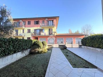 Tornando al piano terra, la portafinestra del soggiorno si apre su un grazioso giardino sul retro, ideale per godere di momenti di relax all'aperto. Completa la proprietà un'autorimessa e un posto auto esclusivo, garantendo praticità e comodità.
