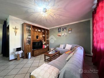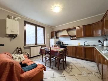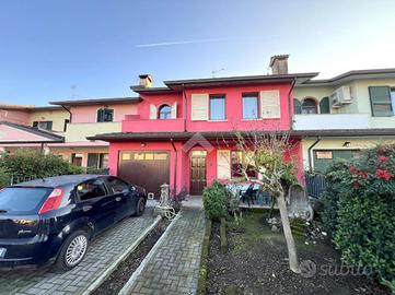 Villa a schiera su due livelli con porticato, giardino fronte e retro e posto auto davanti all'autorimessa.