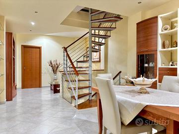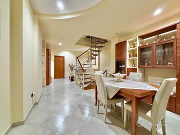 La casa presenta porte in legno a scrigno, pavimento in gres porcellanato chiaro al piano rialzato e in tavernetta, parquet doussié al primo piano e lungo la scala a chiocciola che collega tutti e tre i livelli, controsoffitto con faretti LED, infissi in vetrocamera, tapparelle elettriche nelle finestre a soffitto, videocitofono su ogni piano e impianto elettrico sezionato a zone.