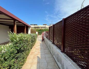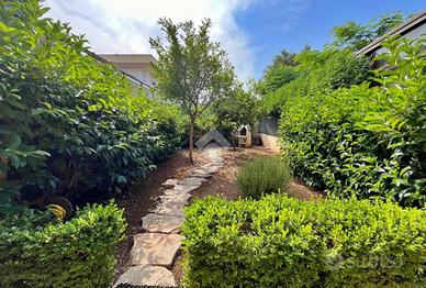 La villa dispone di un doppio giardino. Nel giardino anteriore è presente un box auto coperto, mentre il giardino posteriore ospita una zona verde e una lavanderia esterna con lavabo.