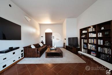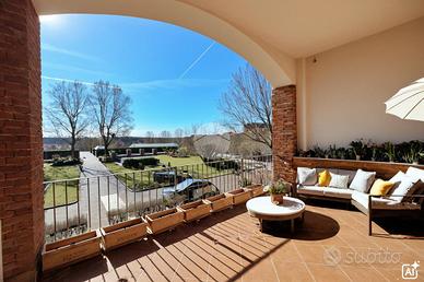 La cucina di circa 32 mq colpisce per la luminosità naturale, grazie all'affaccio diretto su uno splendido terrazzo coperto di 21 mq esposto a sud, uno spazio ideale per creare un salotto outdoor da godere in ogni stagione.