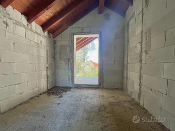 La zona notte è al piano superiore composta da camera letto con sfogo su un terrazzino con vano caldaia, bagno e ulteriore camera di circa 30 mq ad oggi sottotetto, particolarizzata da travi a vista.