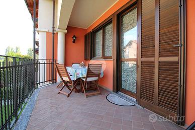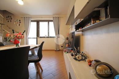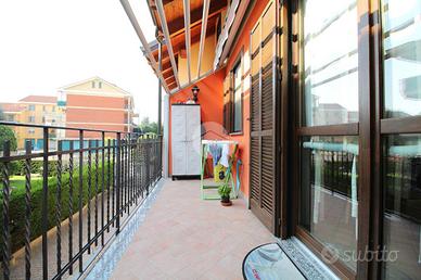 La cucina abitabile è separata da una doppia porta scorrevole ed è possibile sfruttare due lunghe pareti per inserire l'apposito arredo. La portafinestra conduce sul balcone che è accessoriato con tenda estiva automatizzata e invernale.
