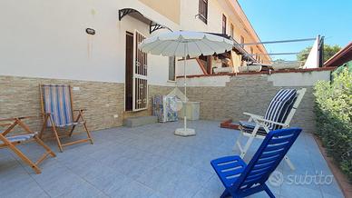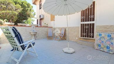 La villa dispone di un ampio terrazzo di mq 34 e un portico di 15 mq sul lato frontale, mentre sul retro ritroviamo un ulteriore terrazzo di 26 mq circa, dove sono presenti sia una doccia esterna che la zona lavanderia, perfetti per momenti di relax all'aperto.
