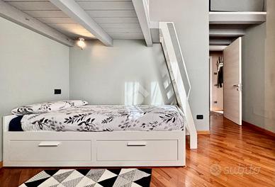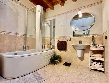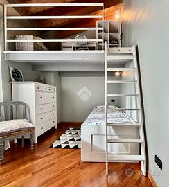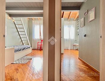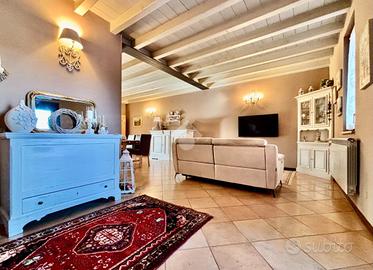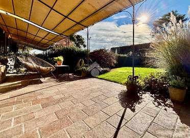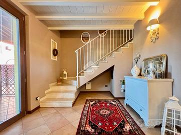 L'immobile è articolato su tre livelli: tramite ampio porticato privato di circa 40 mq con pavimentazione in cotto si accede all'ingresso impreziosito da travi a vista sbiancate, da cui si apre la luminosa zona living completamente open space con soggiorno e cucina distinti, affacciati sul giardino di 85 mq, ottimamente curato e ben piantumato, dotato di gradevole affaccio esterno, bagno di servizio con doccia e zona lavanderia completamente ristrutturata nel 2016. Attraverso la scala in marmo si raggiunge il disimpegno che conduce alla zona notte, dove trovano spazio tre camere di cui due singole con soppalco e travi a vista, una spaziosa camera matrimoniale e bagno finestrato con vasca. Al piano superiore e ubicata la soffitta abitabile di 30 mq, ideale come studio o area relax.