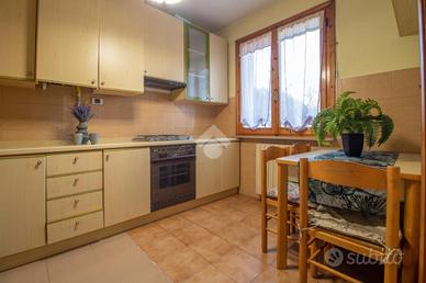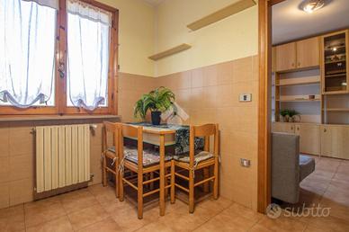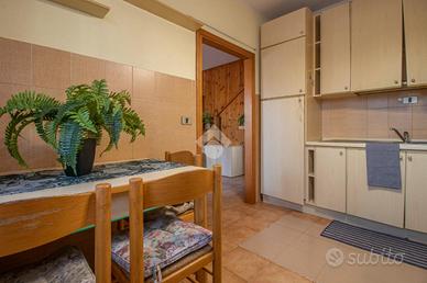 Salendo al piano primo, la zona giorno comprende un luminoso soggiorno, una cucina abitabile ed un bagno finestrato.
