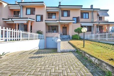 La soluzione da noi proposta in vendita è collocata in una delle zone residenziali più ambite del paese, nella "zona piscine", così definita per l'acquapark "Jolly Club" situato a soli 100 metri. La proprietà, facente parte di un piccolo blocco di cinque villette a schiera, si sviluppa su tre livelli, di cui uno interrato, e gode di doppia esposizione. Un piccolo vialetto in autobloccanti, accostato da un verde prato, fa strada oltre il cancelletto pedonale e quello carraio, conducendo all'ingresso rialzato dell'abitazione. La porta blindata si apre sul disimpegno della zona giorno. Il soggiorno e la cucina occupano due ambienti distinti e separati, garantendo il comfort e le funzionalità per ciascuno spazio. Entrambi godono di accesso al cortile di pertinenza esclusiva; il soggiorno offre l'accesso al giardino di fronte, mentre la cucina, tramite il passaggio dal balcone verandato, accede al cortile sul retro. Il piano della zona giorno è completato da un bagno, dotato di doccia e allacci per la lavatrice. La zona notte si sviluppa al primo piano. Le tre camere da letto ivi presenti possono essere assegnate rispettivamente a camera da letto, cameretta e studio, secondo la metratura che meglio risponde alle esigenze dei futuri proprietari. La cameretta e lo studio godono entrambe di sfogo esterno; la prima sul balcone verandato con affaccio sul cortile interno, la seconda sul giardino di fronte. Completa il piano il secondo bagno, accessoriato di vasca.
