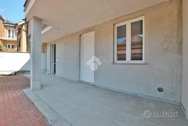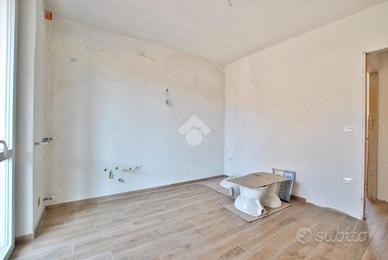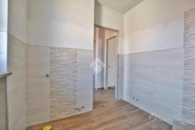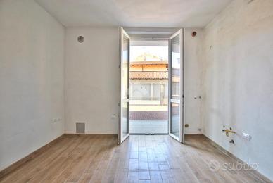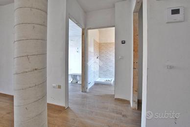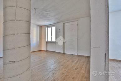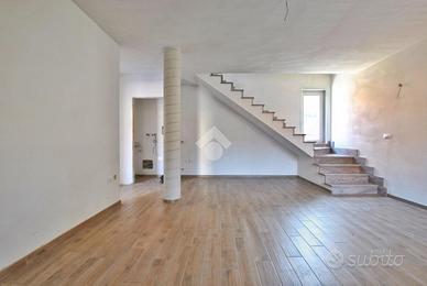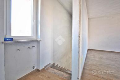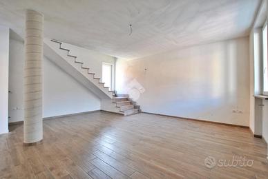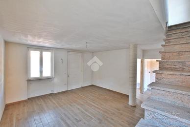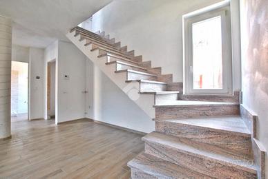 Varcando la soglia d'ingresso, si viene accolti da un ampio soggiorno di quasi 30 metri quadrati, impreziosito dalla scala a vista in granito, che conduce al piano superiore, e da una colonna che introduce un elemento architettonico suggestivo e d'impatto. La cucina è abitabile e dotata di un pratico accesso all'esterno, tramite portafinestra, che permette di usufruire del portico durante le belle giornate primaverili. La zona giorno è servita da un primo bagno con doccia e da un pratico ripostiglio, adibito a locale caldaia. La scala poc'anzi citata conduce al primo piano, dove è stata studiata la zona notte. Un disimpegno centrale anticipa le due camere da letto: una più intima, l'altra di dimensioni generose. Entrambe godono di sfogo esterno; tramite le portefinestre si accede al balcone che, correndo lungo la facciata, si apre armoniosamente su un terrazzino. Anche su questo livello si trova il bagno, completo di doccia.