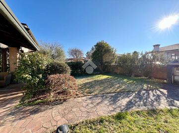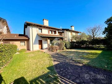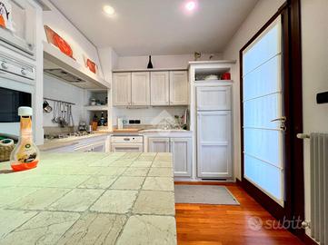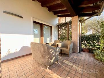Il vialetto in pietra conduce, attraverso il piantumato giardino, al portico d'ingresso dal quale, mediante la porta blindata, raggiungiamo la zona giorno. Questa si compone da un ampio e luminoso soggiorno, reso tale da una porta finestra che apre sul portico d'ingresso, sala da pranzo e una cucina abitabile. La cucina permette, mediante una portafinestra,l'accesso al giardino e ai due posti auto coperti.