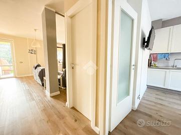 L'ingresso ci accompagna nella zona giorno dove troviamo la sala con accesso al giardino e separata la cucina abitabile. Inoltre al piano terra troviamo anche un bagno cieco con doccia.