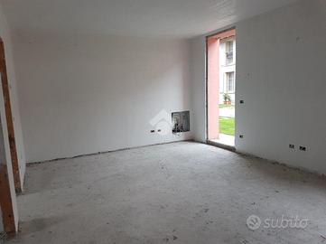 Ingresso diretto al piano terra in soggiorno, cucina abitabile con uscita su giardino privato, disimpegno che conduce ad un bagno finestrato con doccia.
