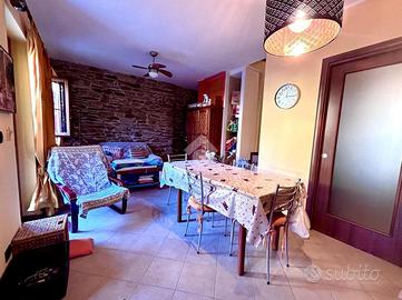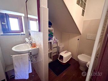 Terra tetto in frazione Allivellatori, disposto in contesto tranquillo e riservato. L'immobile è così disposto, ingresso al piano terra con affaccio sul giardino. Sempre al piano terra sono presenti il salotto, ben illuminato, la cucina, separata dal salotto per offrire maggiore comfort, e un bagno di servizio. Dal salotto si ha accesso alla scala in muratura che conduce al piano superiore. Al piano primo sono presenti due ampie camere da letto luminose, di cui una con cabina armadio, un bagno completo di vasca e doccia e infine un ripostiglio a uso lavanderia. A completare la proprietà un box auto con accesso pedonale sul giardino e una cantina in pietra caratteristica.