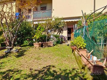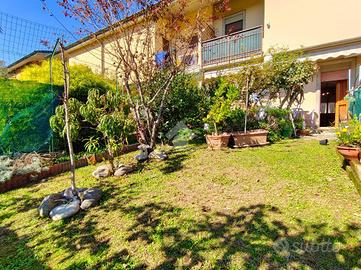 Salendo al primo piano si apre la zona giorno, luminosa e ben organizzata. Qui troviamo un bagno finestrato con box doccia, una cucina a vista con accesso diretto al balcone e un ampio soggiorno, dotato di grande portafinestra che conduce al giardino privato di circa 60 mq. Questo spazio verde, riservato e curato, è ideale per pranzi all'aperto, momenti di relax o per ospitare una seconda entrata pedonale indipendente.