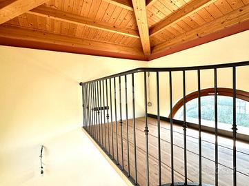 Il piano terra ospita una luminosa zona giorno impreziosita dalle alte travi a vista.