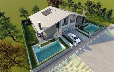 La villa è arricchita da ampie vetrate interne che rendono gli ambienti luminosi ed i 250 mq di giardino la racchiudono sui 3 lati.