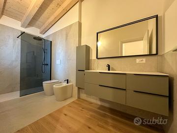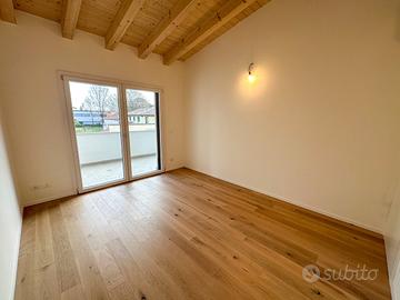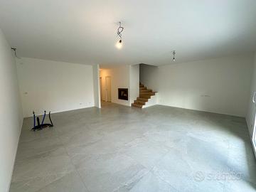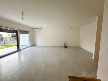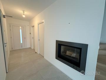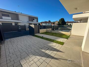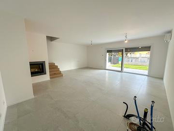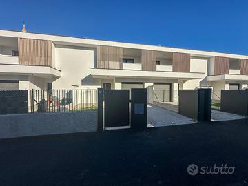 (Riferimento: D-1159-2) FIUMICELLO-VILLA VICENTINA: Sogni una casa nuova, moderna sotto l'aspetto energetico, ma anche progettuale e la vuoi anche subito? Abbiamo quello che fa per te!! A Fiumicello, proprio a due passi dalla chiesa di San Valentino e dalla Piazza del Municipio, ti proponiamo una villa a schiera ampia e luminosa, con una superficie di circa 185 mq commerciali distribuiti su due livelli, progettata con la massima cura per garantire un ambiente di vita sereno e confortevole. L'ingresso alla villetta, avviene tramite strada privata. La vettura può essere parcheggiata all'interno dell'autorimessa con basculante elettrico oppure lasciata esternamente, all'interno della proprietà. L'accesso pedonale conduce al grande soggiorno di forma regolare, con cucina progettata con isola centrale e uscita sul secondo giardino che offre la privacy necessaria. Il soggiorno è impreziosito da un elegante caminetto, già installato e pronto all'utilizzo. Al piano terra si trova anche il primo bagno completo e finestrato e un comodo ripostiglio. Il primo piano è progettato per garantire spazi comodi e ben organizzati, infatti non troverai da nessuna parte una casa nuova con tre camere matrimoniali e ben due ripostigli! Dalla matrimoniale si accede alla prima terrazza, leggermente più piccola rispetto a quella a servizio delle altre due camere. Il bagno è ambio e ben organizzato con una doccia spaziosa e moderna. Esternamente la proprietà è completamente recintata, con impianto di irrigazione automatico per mantenere rigoglioso il verde dei giardini. La pompa di calore e l'impiantistica di supporto per il fotovoltaico sono posizionati esternamente, in un vano dedicato, all'interno del quale si trovano anche gli attacchi per la lavatrice e l'asciugatrice. A lato del basculante del garage si trova anche, per chi è già dotato o sta pensando all'acquisto, la predisposizione per la colonnina di ricarica elettrica dell'autovettura