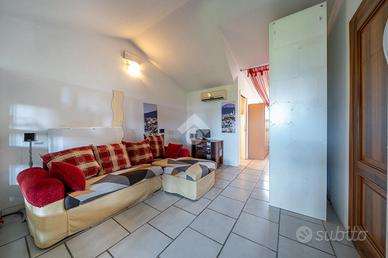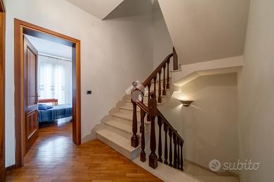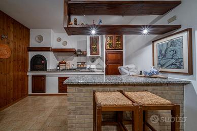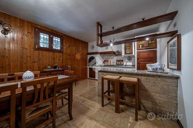 È disposta su quattro livelli. Sul piano rialzato entriamo nel salotto con accesso al balcone coperto, cucina abitabile, bagno di servizio. Dalla cucina, sul retro si accede alla corte pavimentata, ottima per momenti conviviali con amici e parenti in piena privacy, data dalla siepe.