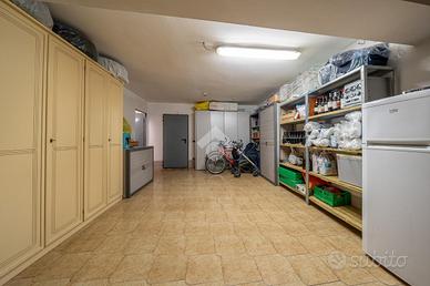 Nel piano interrato, tramite rampa, si accede al garage doppio, con caricatore per auto elettriche. Si entra poi nella lavanderia, in un piccolo deposito, e nella taverna. La taverna è dotata di camino e penisola, decorati con mattoni, che danno un tocco rustico, caldo e familiare alla stanza.