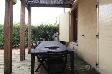 L'immobile è una villetta del tipo a schiera facente parte di un complesso residenziale, costruito nel 2007, caratterizzato da parco privato con piscina. L'immobile si trova nel paese di San Vincenzo di Galliera. L'ingresso all'abitazione è indipendente e avviene dal giardino privato posto sul fronte. La zona giorno, dalla forma rettangolare, è a pianta aperta e si prolunga nel porticato posto sul retro. La forma e le dimensioni del piano terra permettono, se necessario, la creazione di una camera. Il piano superiore ospita gli ambienti della zona notte, con pavimentazione in parquet e travi a vista. Il piano, oltre alle due camere, comprende un secondo bagno, la cabina armadio ed un terrazzo di circa 35 mq. Gli ambienti della casa sono completi di arredo. Il riscaldamento è autonomo ed è presente l'impianto di aria condizionata. La proprietà si completa di garage.