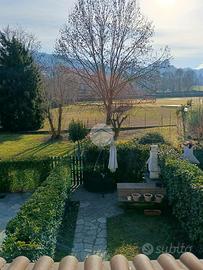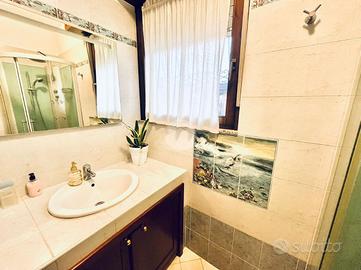 Una scala in legno accompagna al piano superiore, dove si trovano un secondo bagno con vasca, una cameretta molto luminosa con cabina armadio e una camera matrimoniale dotata di terrazzo verandato con affaccio sul giardino. Il piano sottotetto, allo stato grezzo, è particolarmente ampio e illuminato da due lucernari Velux. L'immobile è dotato di ampi infissi in legno con doppio vetro, il riscaldamento è autonomo con caldaia a condensazione recentemente sostituita, l'immobile ha un impianto fotovoltaico con batterie di accumulo.