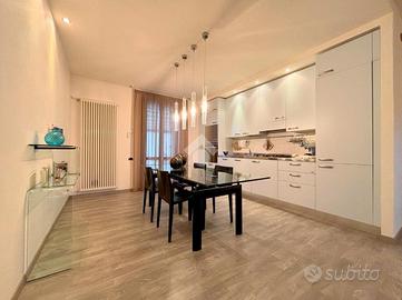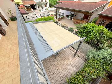 La cucina abitabile si affaccia su un giardino privato sul retro, corredato di pergola elettrica le cui tende possono essere facilmente aperte e chiuse in base alle condizioni atmosferiche utilizzando un telecomando, perfetto per chi ama trascorrere del tempo all'aperto.