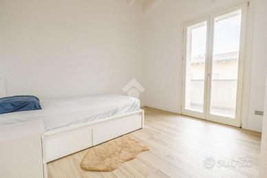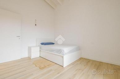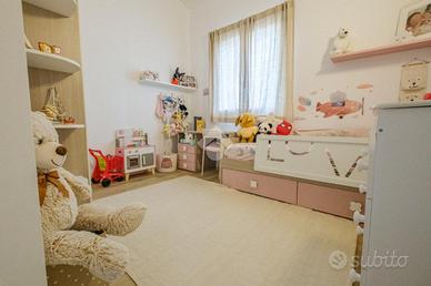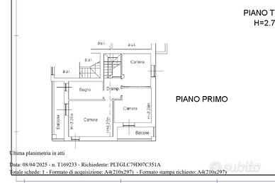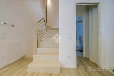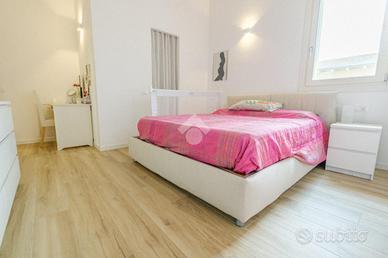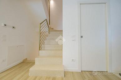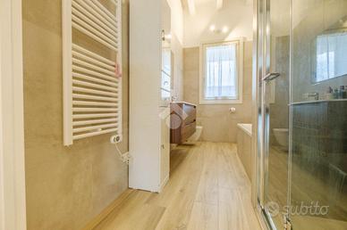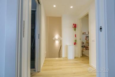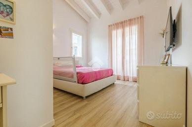 Al primo piano si sviluppa la zona notte con due camere singole e una camera matrimoniale arricchita da cabina armadio. Il piano è impreziosito da travi a vista in legno sbiancate che donano carattere all'immobile. Un ampio bagno con box doccia e vasca serve le camere.