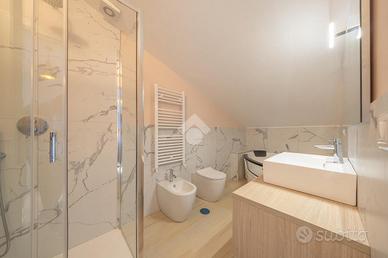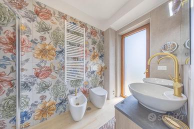 Il piano primo ospita due camere matrimoniali luminose e ben proporzionate, entrambe servite da due bagni curati nei dettagli, di cui uno interno alla camera padronale.