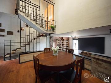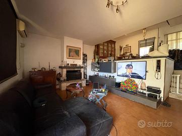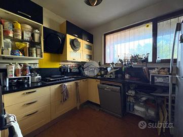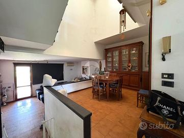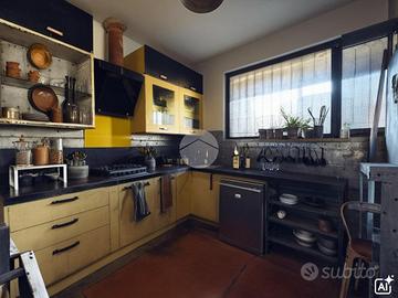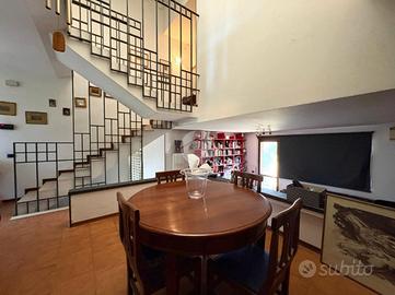 L'abitazione si apre al piano terra sulla zona giorno di buone metrature dove troviamo sala da pranzo, abbellita e ben illuminata da un lucernario tutta altezza e cucina separata. Scendendo qualche gradino invece trova la sua posizione la vera e propria zona living che concede un accesso sul giardino sul retro tramite un'ampia vetrata che dona luminosità allo spazio.
