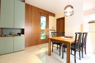 Salendo al primo piano, vi accoglie un luminoso soggiorno, con affaccio sul piccolo giardinetto e una sala da pranzo con angolo cottura, dalla quale si accede alla corte pavimentata sul retro della casa, perfetta per cene all'aperto.