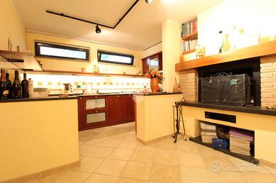 Al piano terra, troverete un garage, attualmente adibito a cantina, con accesso diretto alla grande taverna che è il cuore della casa, con un accogliente caminetto, cucina attrezzata, tavolo da pranzo, studiolo e bagno.