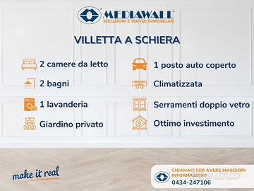 (Riferimento: BR-171-RV) Maniago (Rif. BR-171-RV) In zona residenziale verde e tranquilla proponiamo in vendita questa spaziosa villa a schiera su 2 piani oltre al sottotetto soppalcato, con 2 camere da letto e 2 bagni, molto luminosa e confortevole, dotata di riscaldamento termoautonomo e già climatizzata. Si compone al piano terra da ampio e luminoso soggiorno, cucina separata ed arredata, locale lavanderia/centrale termica, servizio e portico; al primo piano da 2 camere da letto, terrazzo, 1 bagno spazioso, un ampio ripostiglio ed un locale guardaroba in cui ricavare un eventuale ulteriore bagno. Il sottotetto ospita un comodo ripostiglio accessibile da scala retrattile. Sul retro troviamo il giardino esclusivo e sul fronte un comodo posto auto coperto ed un'ampia area esclusiva recintabile. Dotazioni: portoncino blindato; doppio clima; serramenti in legno/doppio vetro; ampia e comoda lavanderia, giardino recintato. Se davvero vuoi passare da un appartamento ad una soluzione indipendente contattaci subito e prenota la tua visita! Abitabile da subito! Data la diversità di tipologie di abitazioni presenti, le case potrebbero parzialmente differire dalle foto pubblicate.