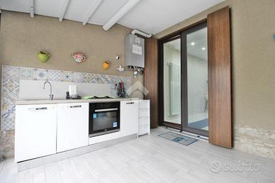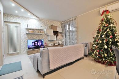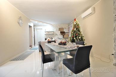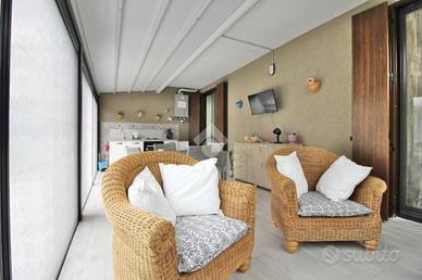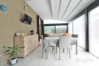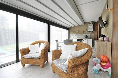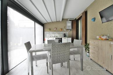 L'ingresso si apre su una luminosa e ampia zona giorno, composta da una confortevole area living e da una cucina a vista, con accesso diretto allo spazio esterno di proprietà, impreziosito da una veranda chiusa di circa 20 mq, ideale da vivere in ogni stagione dell'anno.