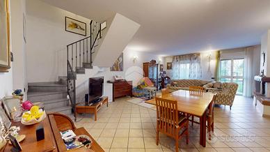 Al piano terra, l'ingresso conduce ad un accogliente soggiorno doppio, caratterizzato da ampie vetrate che conferiscono luminosità e apertura sull'esterno, cucina separata e bagno per gli ospiti. Adiacente, un giardino privato offre un angolo di tranquillità, ideale per momenti di relax o per cene all'aperto durante la bella stagione. I due piani superiori ospitano la zona notte con quattro camere da letto, di cui una con bagno en-suite ed un ulteriore bagno..