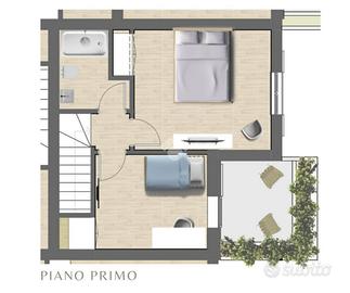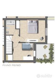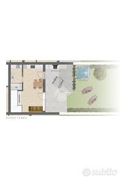 * Piano terra: soggiorno con angolo cottura, bagno e accesso diretto all'area porticata e giardino;
