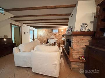 L'ingresso è dal piano terra, direttamente nella zona giorno caratterizzata da un luminoso soggiorno con camino e con tripla esposizione e accesso diretto alla cucina angolare finestrata.
