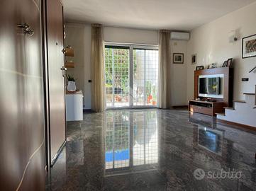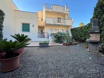 Noicattaro - Sulla provinciale per Noicattaro, nel rinomato Complesso Parco Evoli, vendesi villa a schiera con giardino di proprietà. L'immobile è disposto su 3 livelli; soggiorno, cucina abitabile e bagno al piano terra, disimpegno con 3 camere da letto e bagno al primo piano e tavernetta al piano seminterrato. Terrazzo di proprietà.