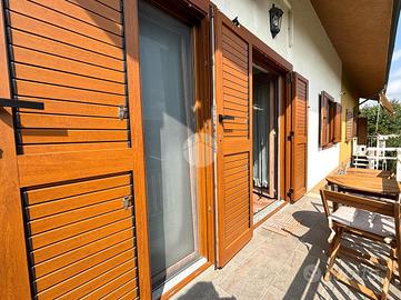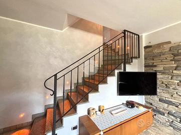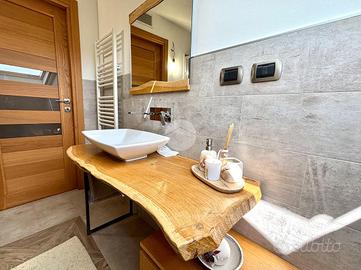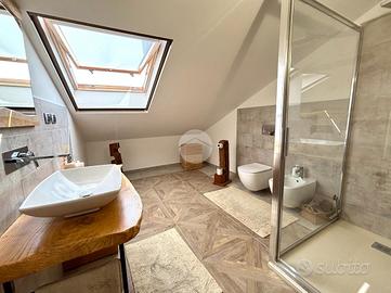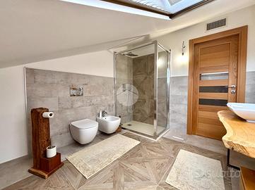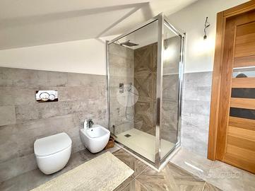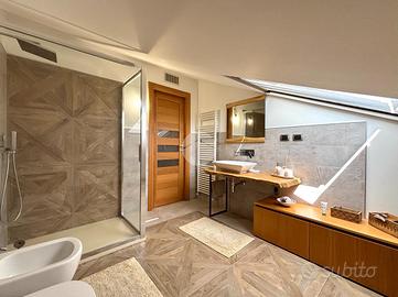 Una scala in rovere conduce al piano superiore, organizzato in due camere, cabina armadio e bagno finestrato con doccia moderna. Qui il comfort è garantito da impianto di condizionamento canalizzato con termostato indipendente e riscaldamento tramite bocchette. Le porte interne, come la scala, sono in rovere massello.