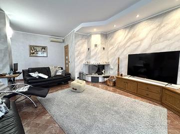 Al primo piano si sviluppa la zona giorno: ampio salotto open space con termocamino e cucina in muratura con cappa industriale. L'ambiente è climatizzato da due split e valorizzato da infissi in alluminio blindato con doppio vetro, zanzariere, persiane verniciate e chiusura di sicurezza. I balconi, fronte e retro, sono dotati di tende da sole automatiche.