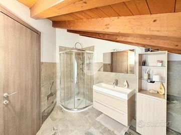 Salendo al primo piano, impreziosito da suggestive travi a vista, troviamo una spaziosa zona notte, un secondo bagno dotato di doccia e una suggestiva terrazza con vista panoramica sul lago d'iseo.