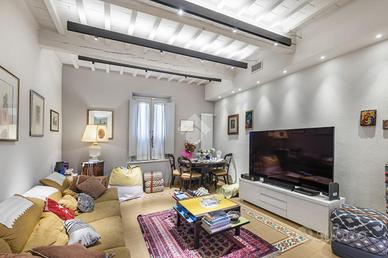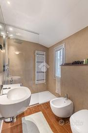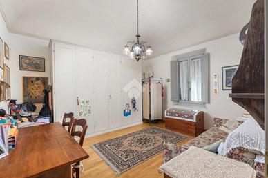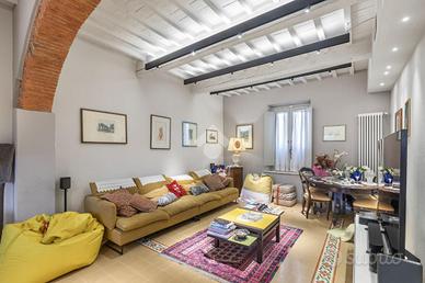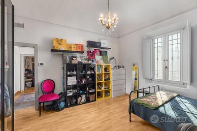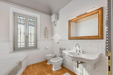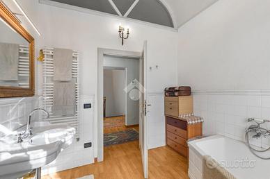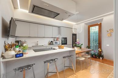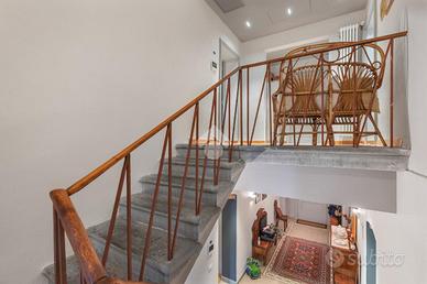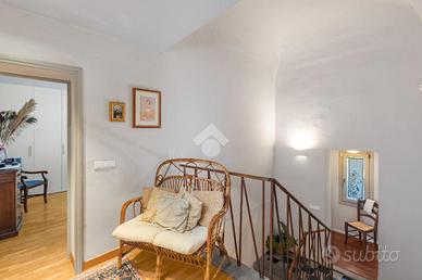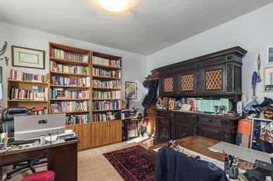 Al piano terra, l'ampio e luminoso doppio soggiorno caratterizzato dal camino a gas è separato dalla cucina abitabile, dotata di una cucina di design su misura. Completano il piano uno studio e un bagno di servizio. I pavimenti in autentiche marmorine del 1921 restaurate, donano un carattere unico e raffinato all'ambiente.