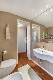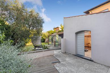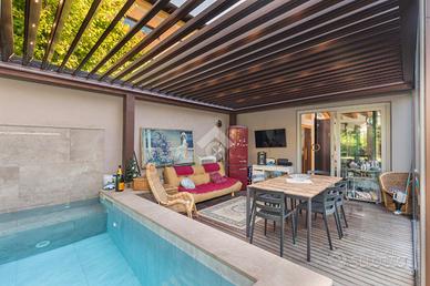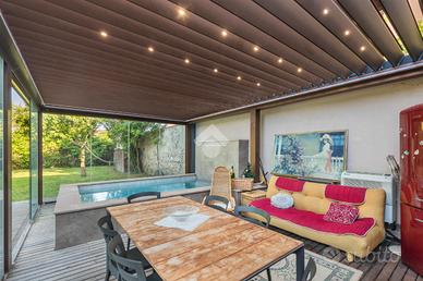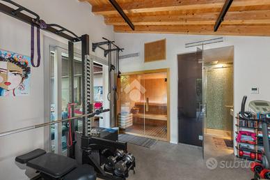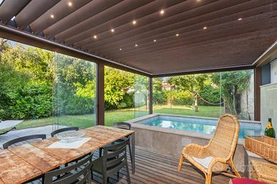 Dal piano terra si accede al fiore all'occhiello della casa: un giardino privato di 300 mq con veranda, piscina riscaldata con idromassaggio e un esclusivo centro benessere completo di sauna, palestra e un bagno dedicato. Un angolo di puro relax, pensato per vivere la casa come una vera oasi privata.