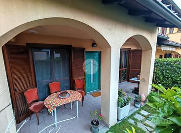 Dal vialetto si accede tramite cancelletto al curato giardino frontale con portico, perfetto per momenti di relax all'aperto.